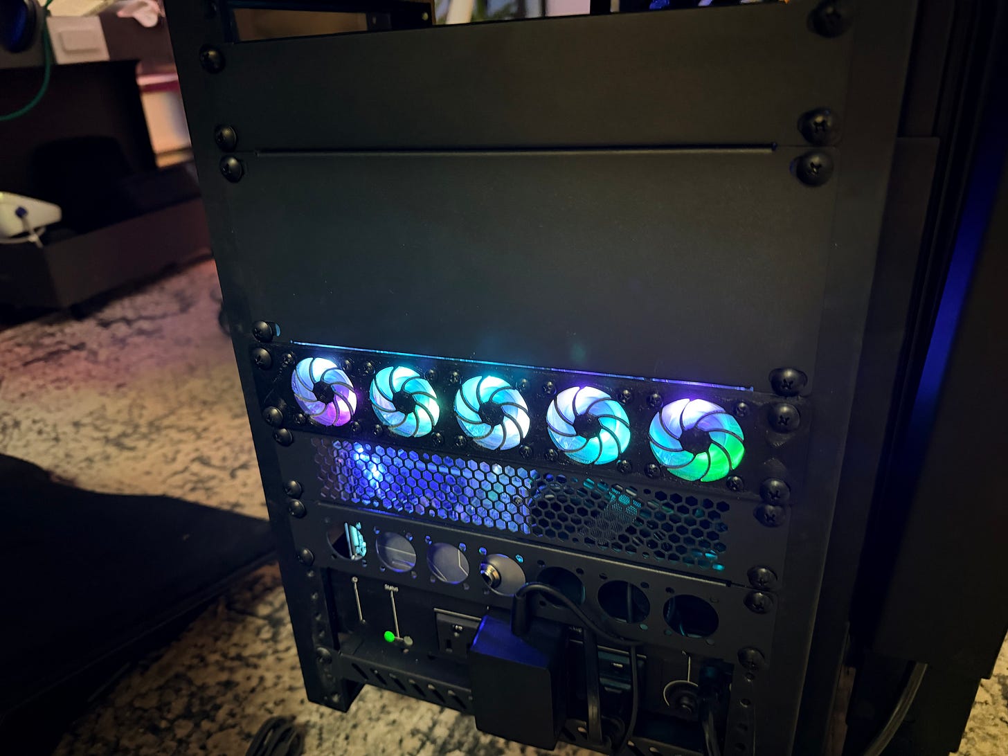 1U 40mm 3d Printed Fan Panel that holds 5 colored USB Fans that I spliced together into 1 USB Cord (I looked for a premade option but didn’t find one)