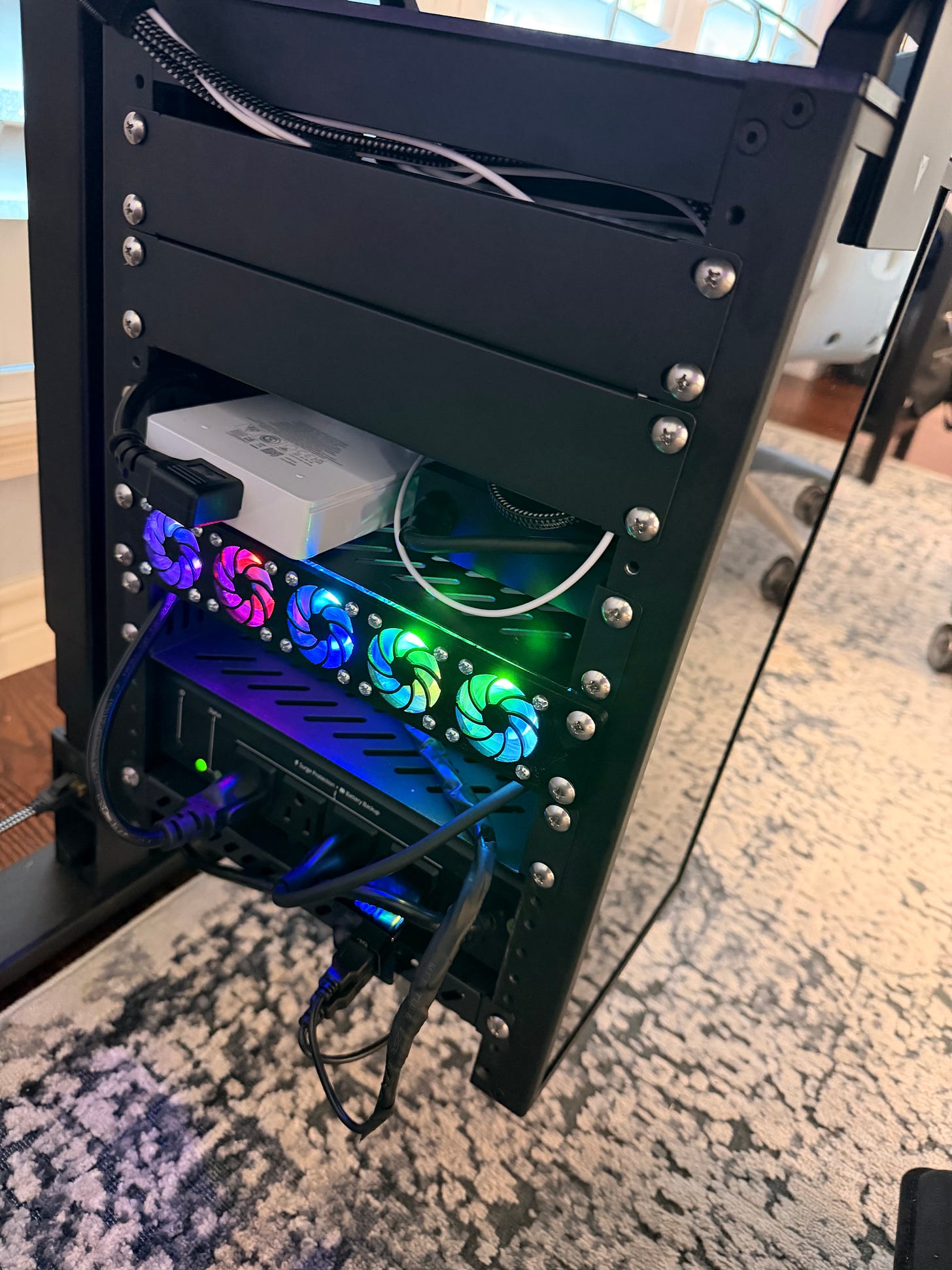 1U 40mm 3d Printed Fan Panel that holds 5 colored USB Fans that I spliced together into 1 USB Cord (I looked for a premade option but didn’t find one) - I didn’t have this one installed when I took the photos but it’s just like the other one in the other rack except it has black screws.