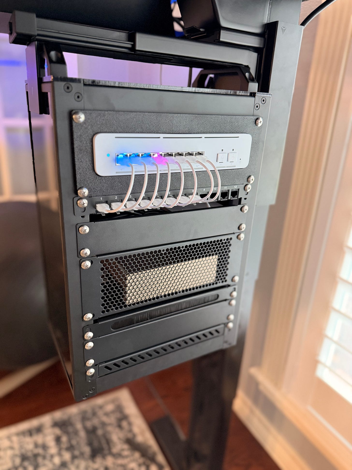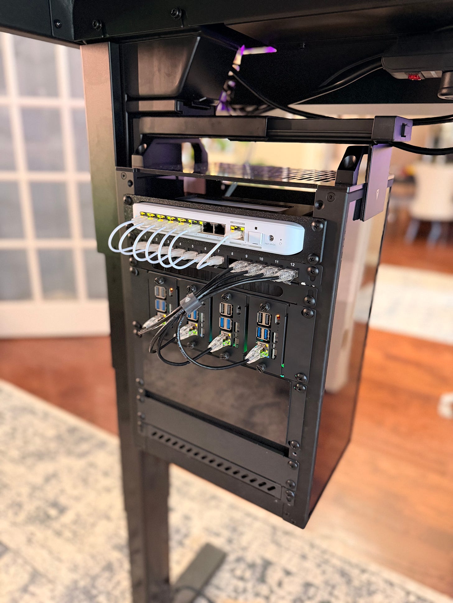 The first one for my pi cluster and the other for my other switch and my Nvidia DGX Spark. I want to thank this page for so much inspiration. I went with two Black DeskPi RackMate T1 Rackmounts (8U). I have a Secret Lab Magnus Pro desk so I ended up mounting these using 2 Premium PC Mounts for an incredible under desk look.